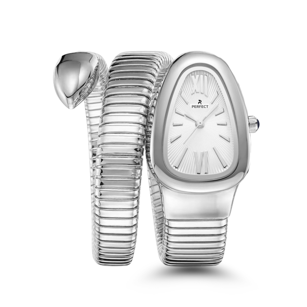 ساعة نسائية فاخرة بتصميم ثعبان مزدوج باللون الفضي ، مينا أبيض أنيق، وإطار البراق. تجمع بين الفخامة والتميز وتناسب الإطلالات الراقية.