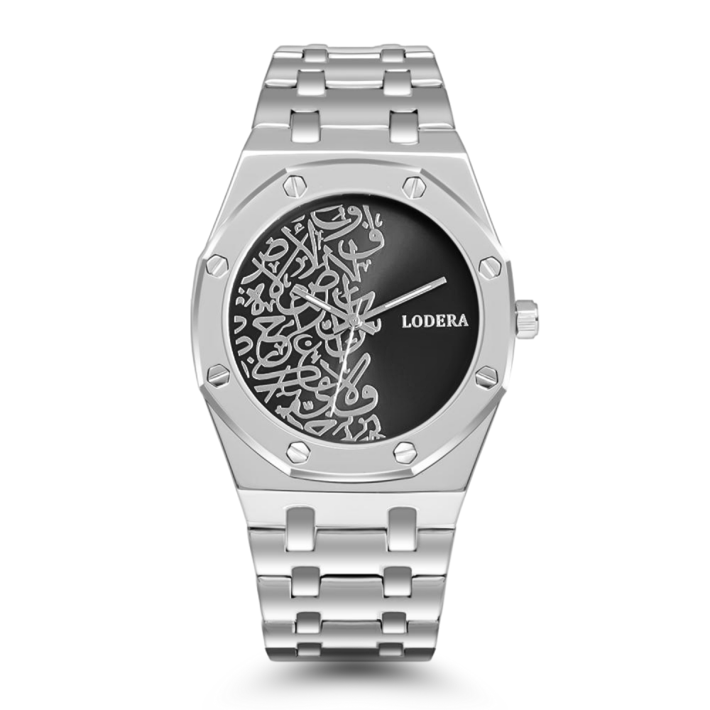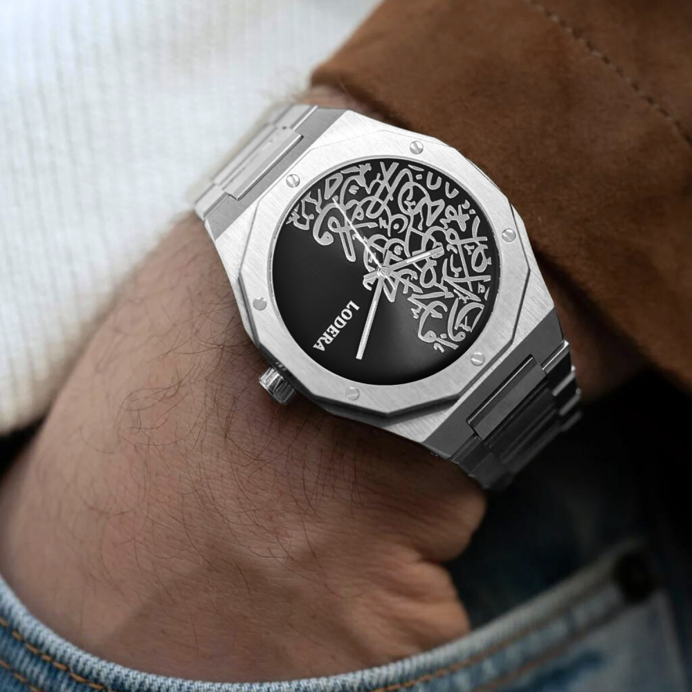 ساعة رجالية الهيبة و الاصالة العربية ، يكتمل حضورها بسير ستيل عملي ومينا الساعة بزخرفة عربية يمنحها تميز وأناقة في كل لحظة تعكس اصالتنا ورصانة الاختيار، كأنها تحاكي قوة وتماسك الرجل في عزته ووقاره. قطعة تليق بمن يفتخر بانتمائه ويحمل معصمه رمزًا للأناقة والاعتزاز.